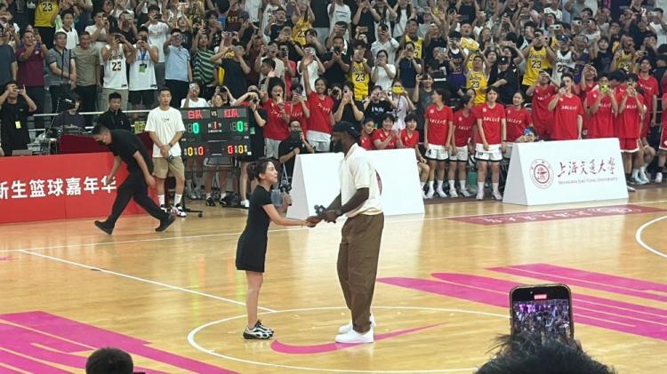 据“东方体育日报”抖音号、“詹姆斯吧官方微博”、小红书用户“篮球摄手虎”等媒体的报道,詹姆斯到场后向现场球迷招手问好,并帮助场上交大学生的比分完成跳球。